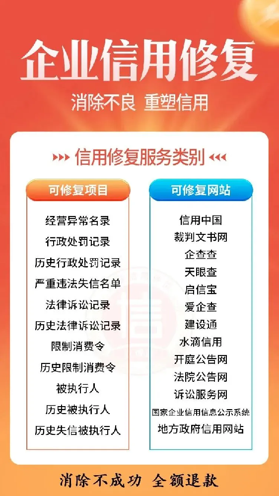 我们作为专业从事企业信用修复的服务机构,实现全国全区域全行业覆盖,涉及行政处罚记录、司法诉讼记录等问题,均可在企业履约完成后进行修复。在企业信用修复领域,我们打通源头官网(如信用中国、国家企业信用信息公示系统等)、第三方民用平台(如企查查、天眼查等)、人民法院和地方法院、行政处罚部门(如环保局、税务局、市场监督管理局等)等多部门多渠道的信用修复环节,快速帮助企业解决信用修复难题。